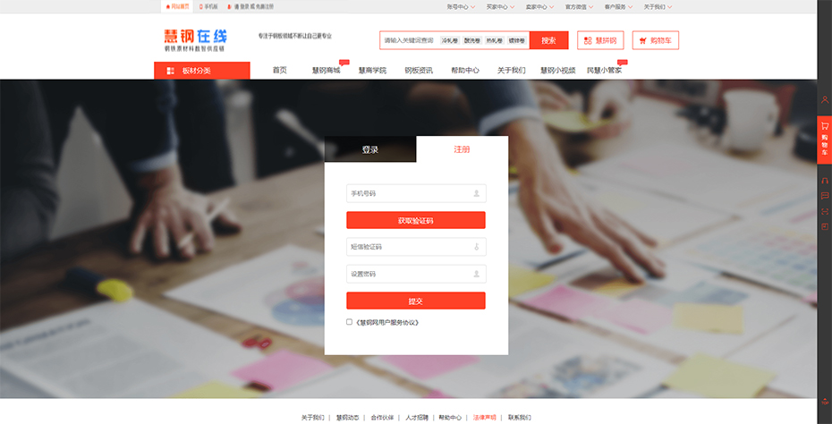 (1)訪問慧鋼在線首頁www huisteel com(2)點(diǎn)擊網(wǎng)站左上角免費(fèi)注冊(3)輸入想要注冊的手機(jī)號和驗(yàn)證碼,點(diǎn)擊獲取短信驗(yàn)證碼,隨后回收到