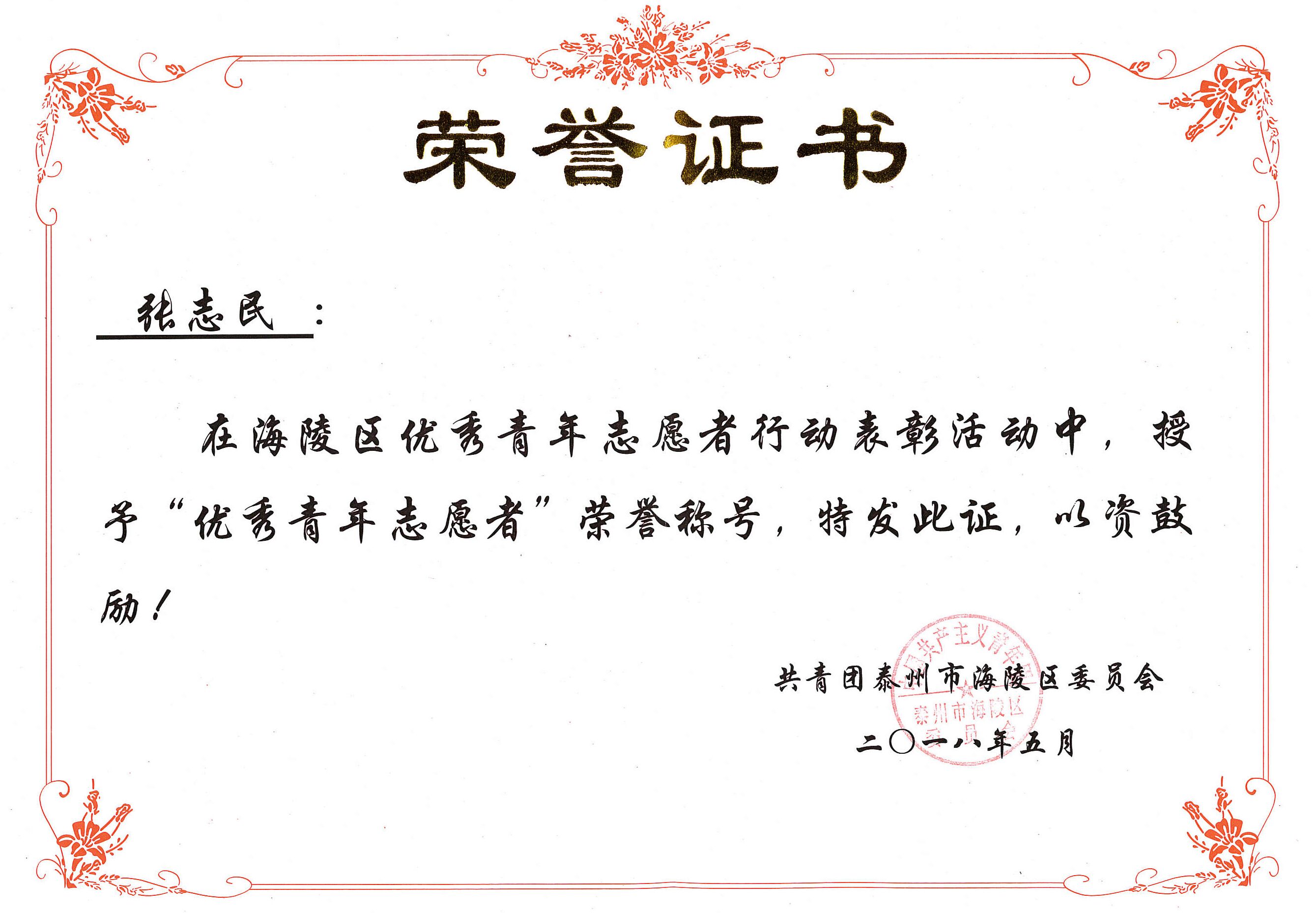 2018年5月,張志民在海陵區(qū)優(yōu)秀青年志愿者行動中,授予“優(yōu)秀青年志愿者”榮譽稱號。