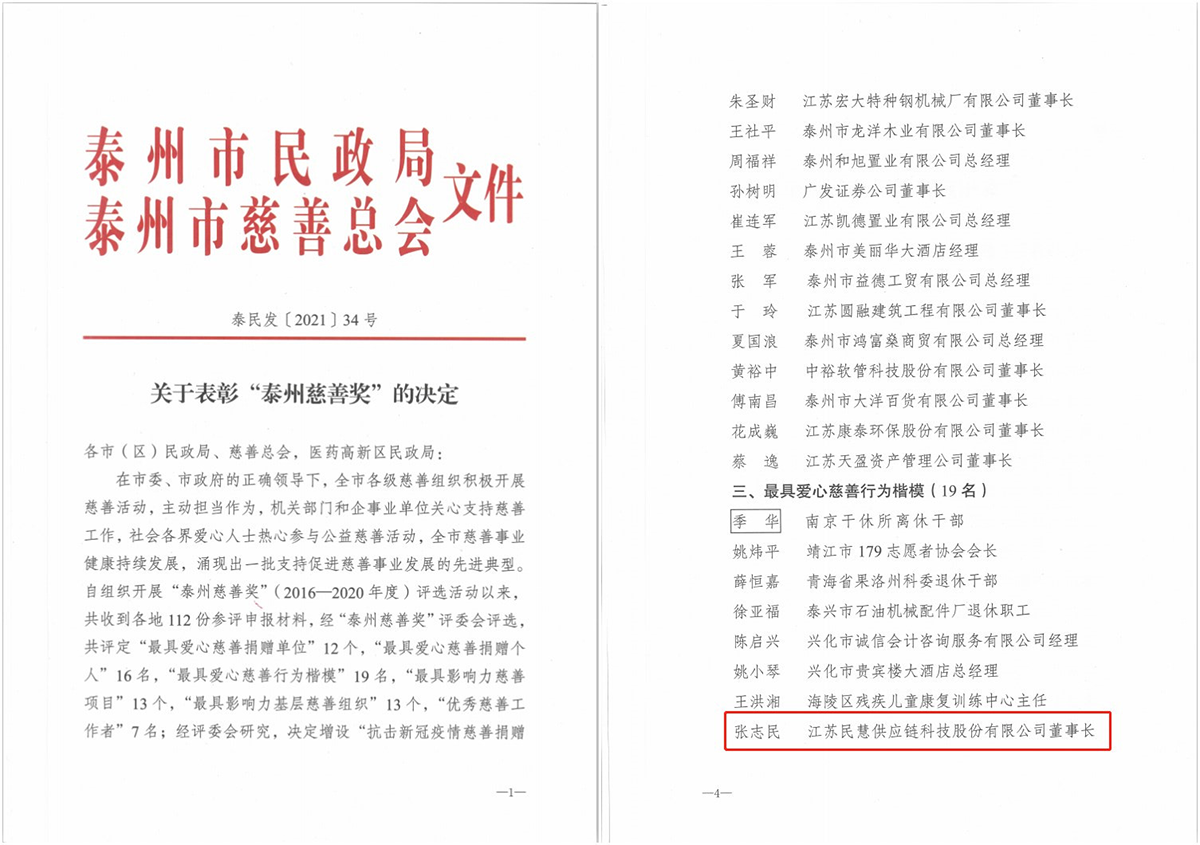 張志民董事長(zhǎng)表示,獲得這項(xiàng)榮譽(yù)不僅是政府與社會(huì)各界對(duì)江蘇民慧的肯定,也是對(duì)慈善事業(yè)的肯定,更是向全社會(huì)傳遞了“人人為善”的正能量。未來(lái),張董將繼續(xù)用實(shí)際行動(dòng)關(guān)注民生、關(guān)愛(ài)社會(huì),在建設(shè)“強(qiáng)富美高”新泰州,人民滿意幸福城市的實(shí)踐中,展現(xiàn)慈善作為,貢獻(xiàn)公益力量,踐行時(shí)代擔(dān)當(dāng)。