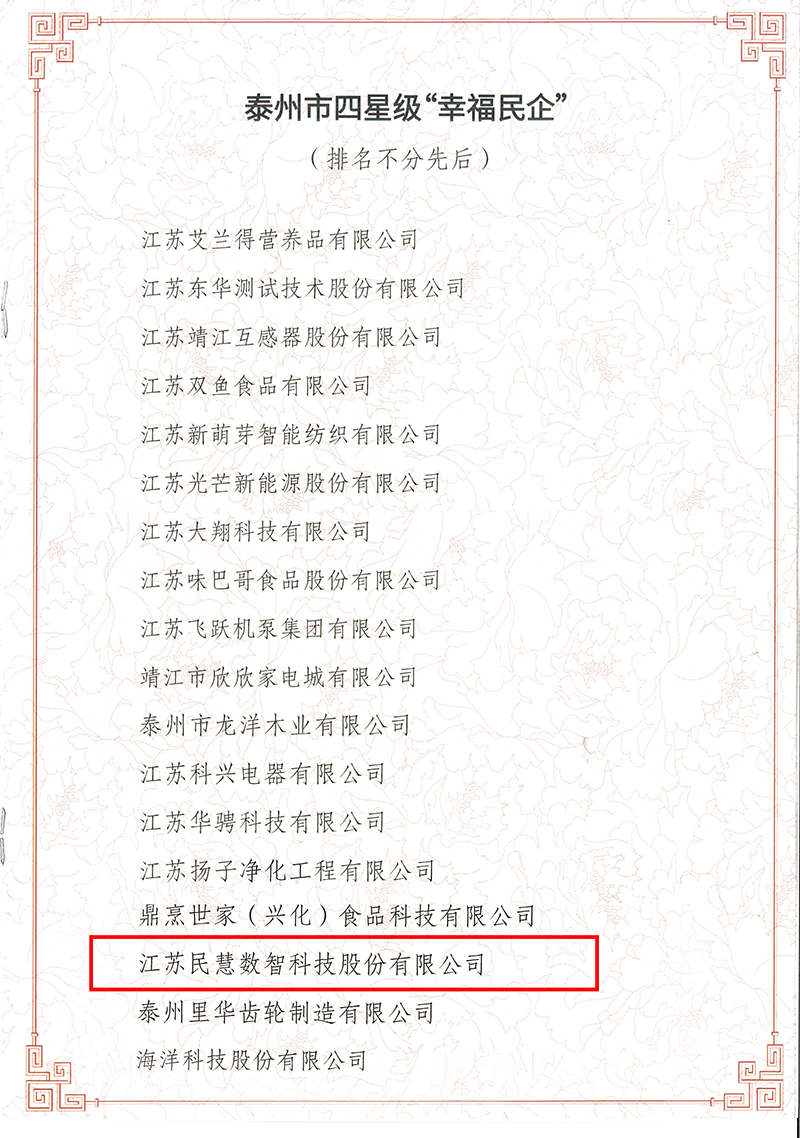 民慧股份榮獲泰州市首批四星“幸福民企”認(rèn)定