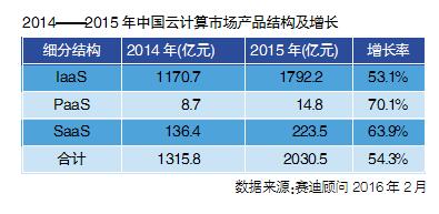 賽迪顧問(wèn)發(fā)布的《2014-2015年中國(guó)云計(jì)算市場(chǎng)產(chǎn)品結(jié)構(gòu)及增長(zhǎng)》顯示,2015年我國(guó)SaaS市場(chǎng)規(guī)模達(dá)到223.5億元,增長(zhǎng)63.9%。在2016年乃至可預(yù)見(jiàn)的未來(lái),SaaS仍將進(jìn)一步擴(kuò)大市場(chǎng)規(guī)模。