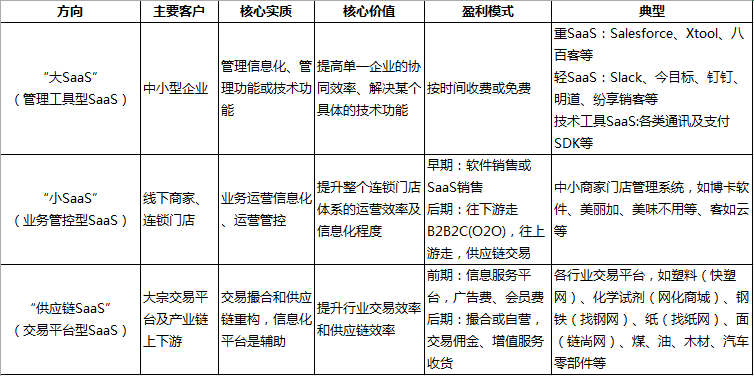 關(guān)于SaaS領(lǐng)域的分類,通常可以按照“通用-垂直”、“技術(shù)-管理-業(yè)務(wù)”等維度進(jìn)行劃分?;趹?yīng)用場(chǎng)景以及盈利模式這一維度,可以將SaaS細(xì)分為三個(gè)方向:“大SaaS”、 “小SaaS”以及“供應(yīng)鏈SaaS”,如下表。